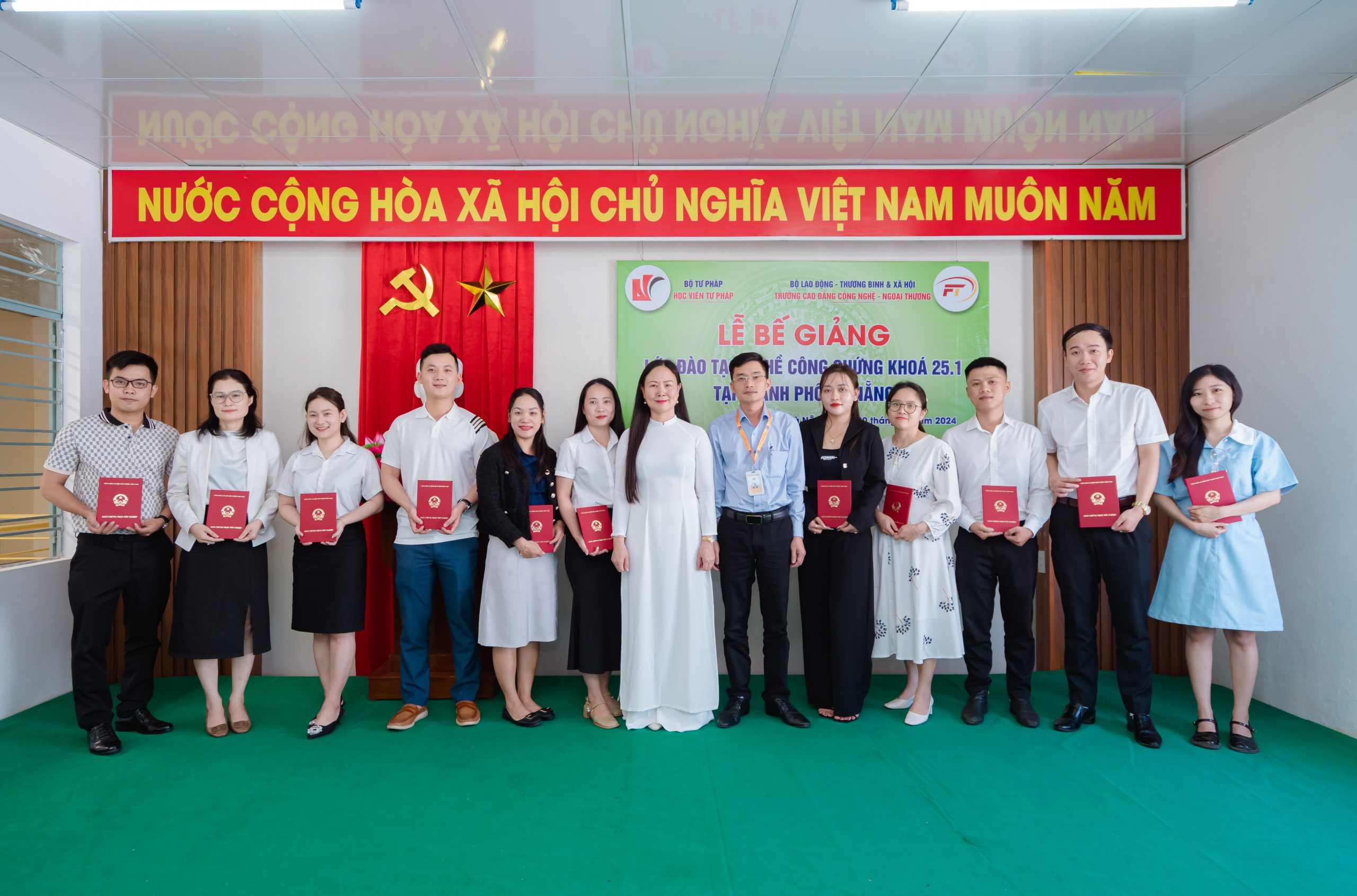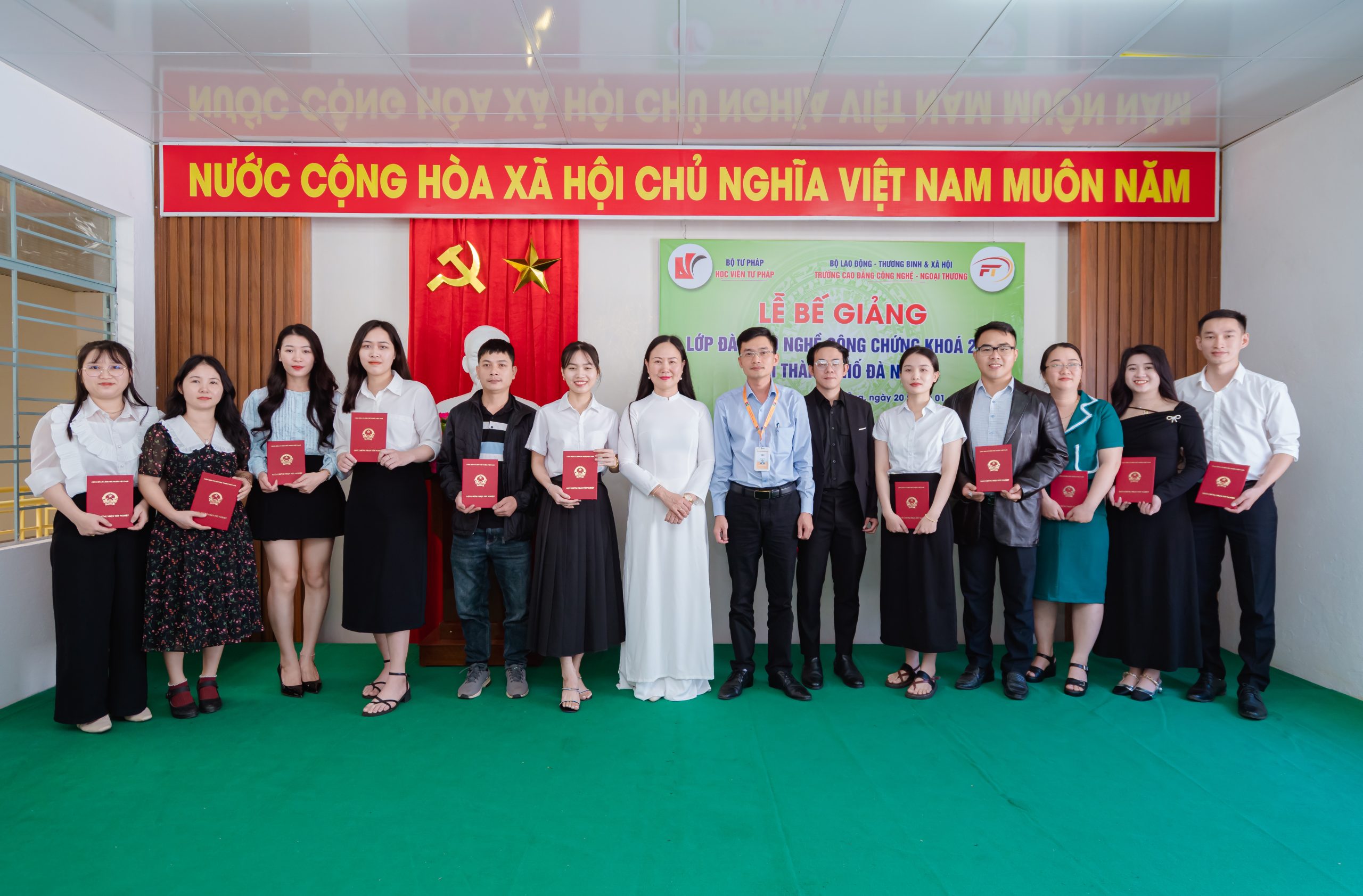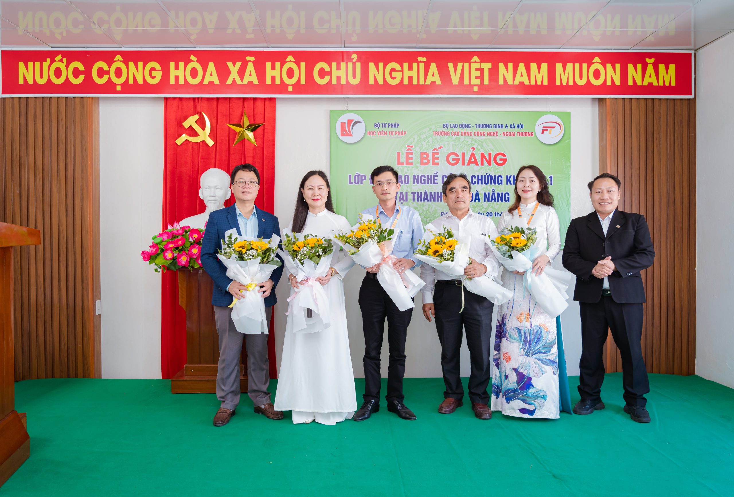 Tham dự Lễ bế giảng về phía Học viện Tư pháp có: PGS. TS. Nguyễn Minh Hằng – Phó Bí thư Đảng ủy, Phó Giám đốc Học viện Tư pháp; TS. Trần Minh Tiến – Trưởng phòng Đào tạo và Công tác học viên; ThS. Trần Thị Hiên – Cán bộ quản lý lớp. Về phía Trường Cao đẳng Công nghệ – Ngoại thương có: Ths. Trần Thanh Trình – Hiệu trưởng nhà trường; Thầy Nguyễn Đức Tịnh – Phó Hiệu trưởng Trường; Cô Nguyễn Thị Mai Hà – Giám đốc Trung tâm liên kết và đào tạo ngắn hạn. Cùng toàn thể các học viên lớp đào tạo công chứng khóa 25.1 tại Đà Nẵng.