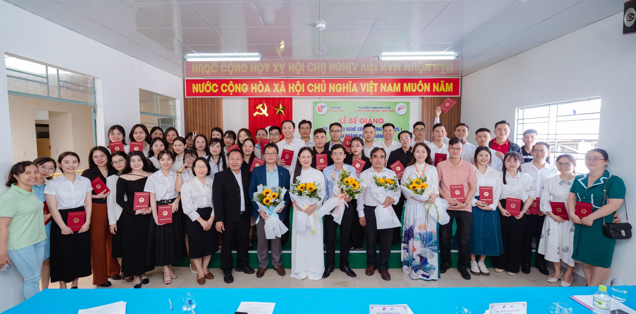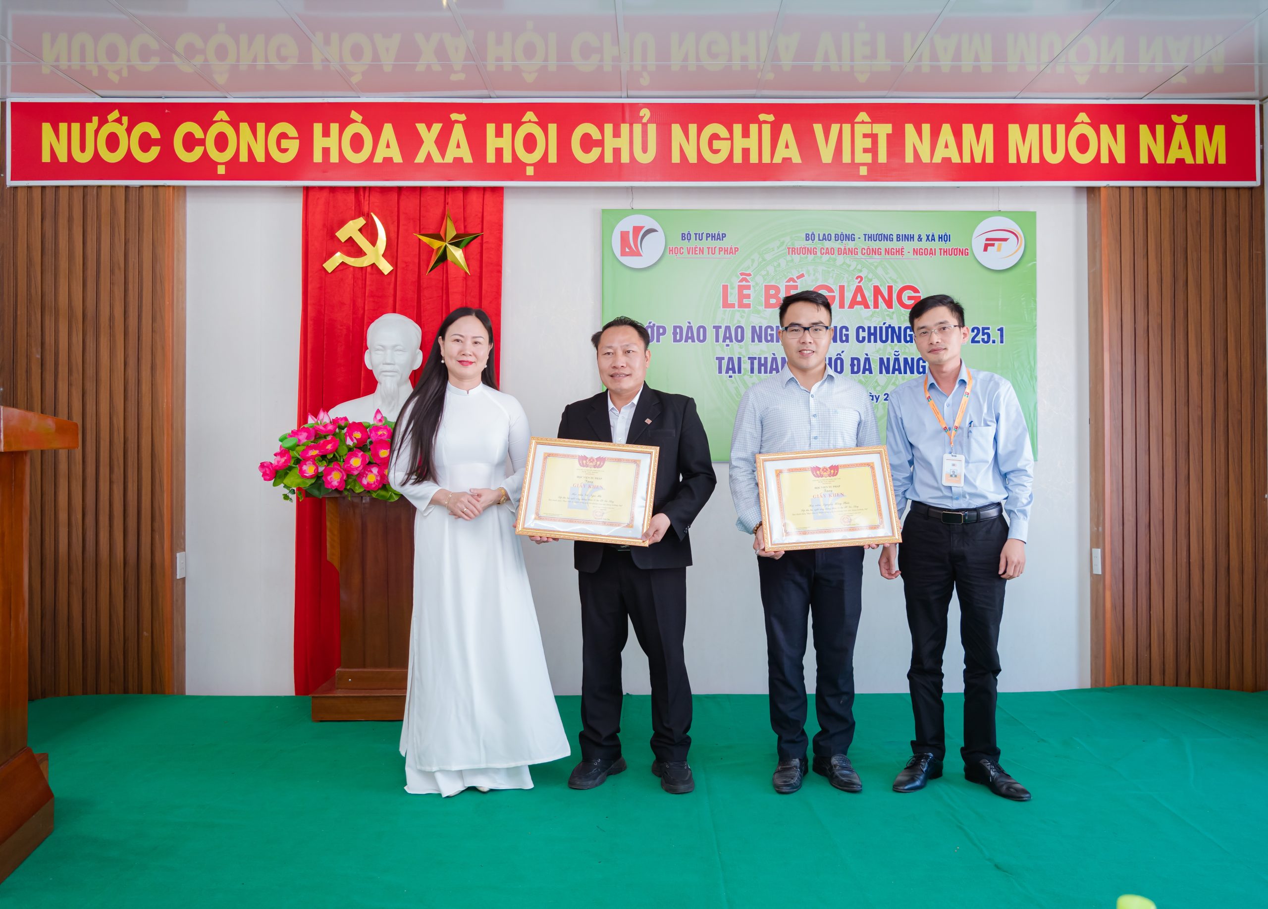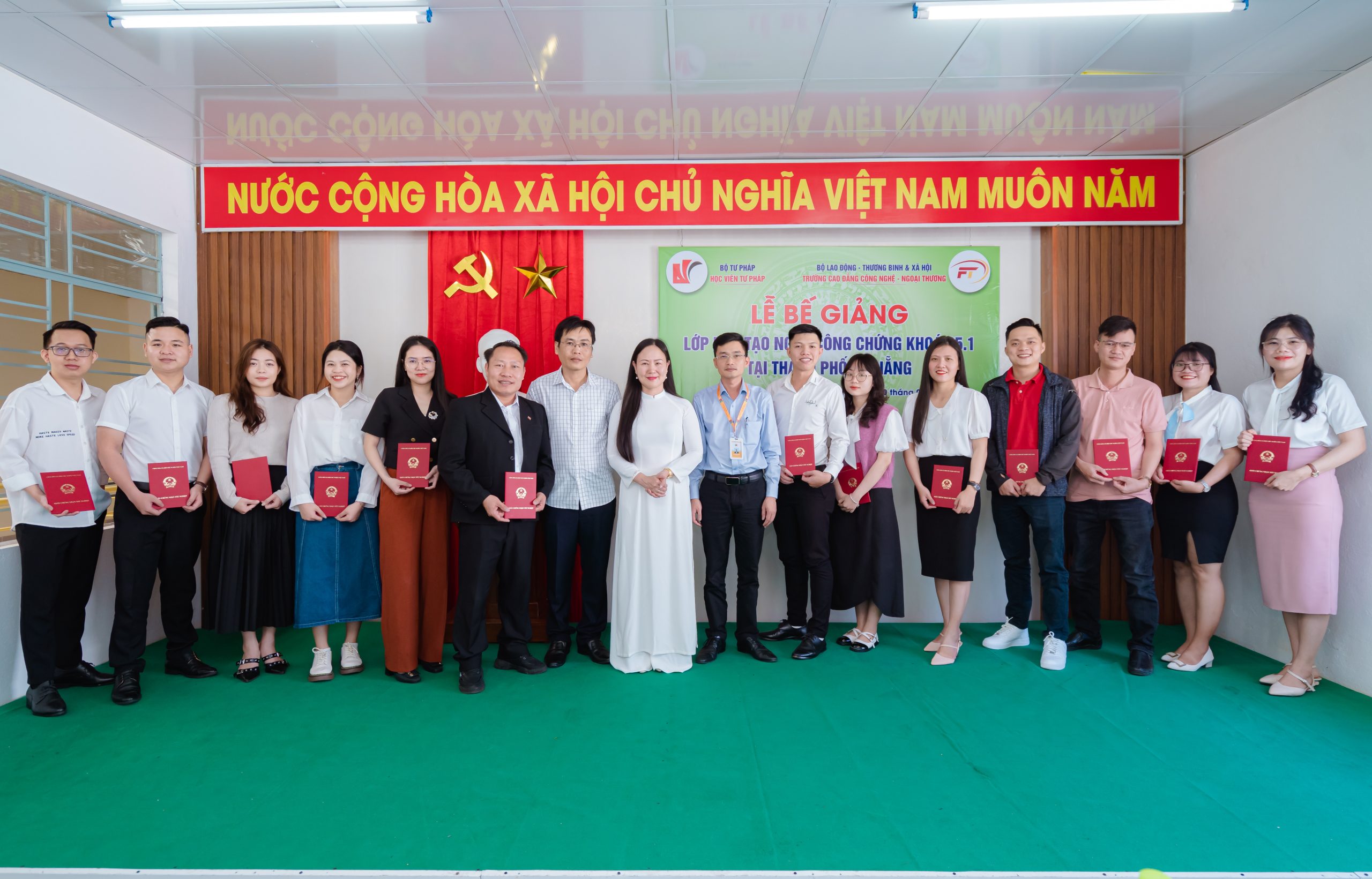 Tham dự Lễ bế giảng về phía Học viện Tư pháp có: PGS. TS. Nguyễn Minh Hằng – Phó Bí thư Đảng ủy, Phó Giám đốc Học viện Tư pháp; TS. Trần Minh Tiến – Trưởng phòng Đào tạo và Công tác học viên; ThS. Trần Thị Hiên – Cán bộ quản lý lớp. Về phía Trường Cao đẳng Công nghệ – Ngoại thương có: Ths. Trần Thanh Trình – Hiệu trưởng nhà trường; Thầy Nguyễn Đức Tịnh – Phó Hiệu trưởng Trường; Cô Nguyễn Thị Mai Hà – Giám đốc Trung tâm liên kết và đào tạo ngắn hạn. Cùng toàn thể các học viên lớp đào tạo công chứng khóa 25.1 tại Đà Nẵng.